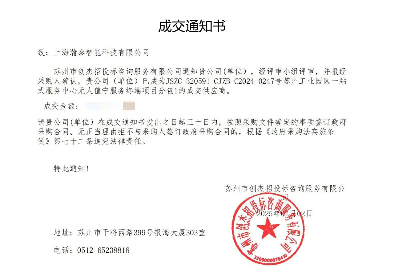 新年伊始,瀚泰智能便传来振奋人心的喜讯,凭借着过硬的产品品质、精湛的专业服务,瀚泰智能中标“苏州工业园区一站式服务中心”无人值守服务终端项目,收获2025年首份硕果,迎来了开门红!